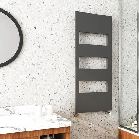 Create an instant focal point in your bathroom with the minimalist styling of the anthracite Arezzo designer radiator. Features a unique bold design which provides plenty of space for all your towels. Manufactured from durable steel with a quality eye-catching Anthracite finish, this stylish designer radiator provides superb heat output which will gently warm towels and your bathroom.