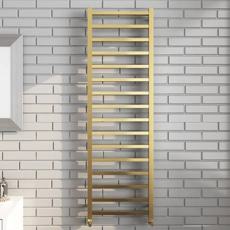 The classic Arezzo square tubed brushed brass heated towel rail is ideal for give your home the latest look in elegant contemporary design. With a straight profile and finished in a eye-catching, brushed brass finish this luxury stylish ladder type towel rail brings a real quality finish to any bathroom. Perfect for keeping your towels toasty and warm as well as creating a focal point in your bathroom. Features 16 square cross rails.