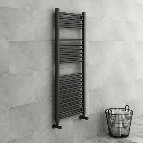 Going for a bold look in your bathroom? Consider this Diamond Heated Towel Rail. In an ultra contemporary dark grey matt finish, the standout look of this towel rail radiator will revamp your bathroom dรฉcor effortlessly โ especially when paired with lighter tiles. It has a modest width of 500mm, making it a good fit for small and medium sized bathrooms. This anthracite vertical radiator is expertly crafted, too, with a long lasting construction of high grade steel. After radiator valves to complete the look? Choose from our extensive range including the Modern Angled Radiator Valves in Chrome.