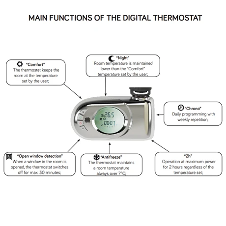 Timer-2 hours mode: The electronic control powers the heating element at the to the previous operational mode. For safety reasons, during the 2h mode the room temperature is automatically controlled in order not to exceed 32 °C