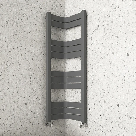 The innovative Milan 1200mm matt anthracite corner heated towel rail will create a sleek, minimal look in your space while keeping your towels toasty warm. This wall-mounted, corner ladder-style towel radiator is a clever space-saving choice for cloakrooms and en-suites.